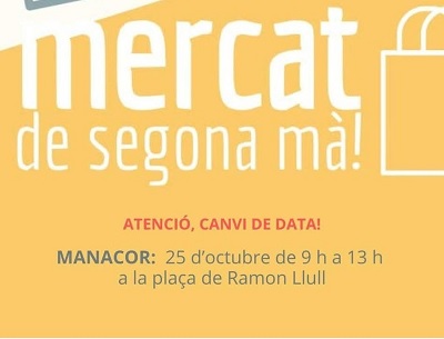 - En Manacor cambio de fecha para el Mercado de 2ª Mano. Estaba previsto que se hiciese el día 11 de octubre, se cambia la fecha y se hará el sábado día 25, plaza Ramón Llull de 9 a 13 horas